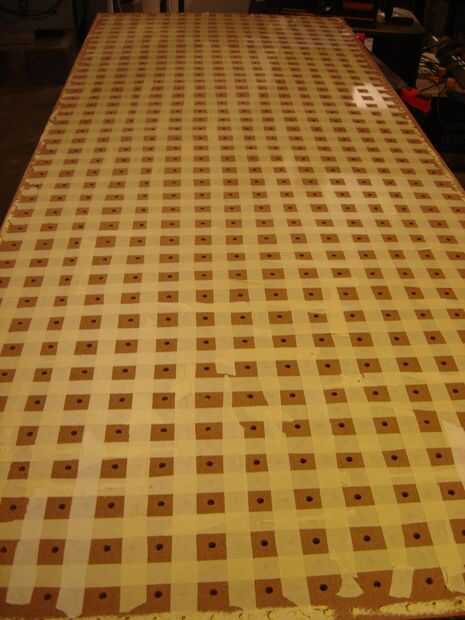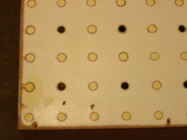 Resulta que tuvieron que perforar los orificios ligeramente para que las bombillas de vidrio no en contacto con la Junta, para después rellenar 600 perforación de los agujeros, luego otro 600, pudo haber hecho más sentido que uso tablero duro perforado los agujeros desde cero y guardar la masilla, pero sin una prensa del taladro, creo que mi red no habría sido muy simétrica. Algo a tener en cuenta.