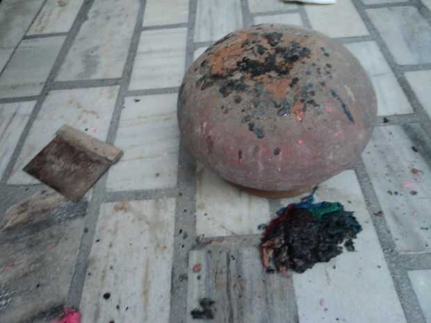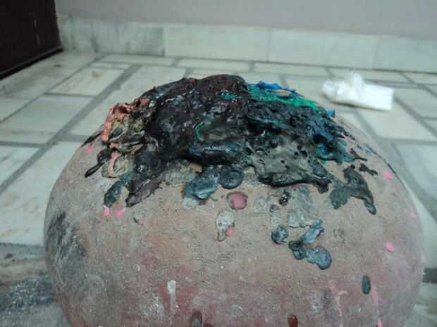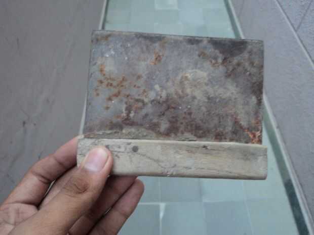 Utilizar una placa de metal (probablemente utilizada por los pintores para masilla de pared antes de pintar en las paredes) para quitar la hoja de la olla de barro.! Hacer esto con cuidado no hagas daño a ti mismo!. Nuestra hoja de doblado interior y parece sólido.