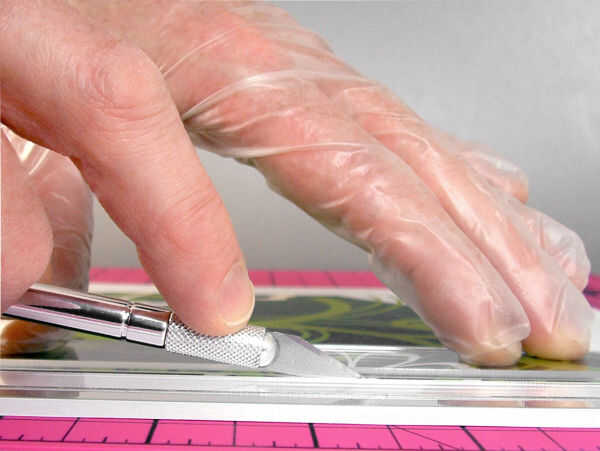Con el borde posterior de un cuchillo de la manía, arrastre una línea a lo largo del interior de la guía de puntuación sujetando firmemente la guía de puntuación en su lugar con la otra mano. (FOTO 4-11) Mantenga el cuchillo en un ángulo agudo y aplique presión durante el proceso. (FOTO 4-12)