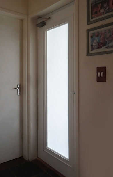 Tengo una casa de nivel doble y el pasaje en la planta baja que comunica todas las habitaciones y el baño es oscuro, sin ventanas y no hay lugar para windows. Después de pensar a través de diversas opciones finalmente decidí montar un panel de vidrio a una puerta estándar de núcleo hueco, y que dejaría en un montón de luz natural. Y el vidrio se le roció con aerosol Rust-Oleum vidrio esmerilado, así que privacidad no será un problema.