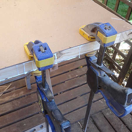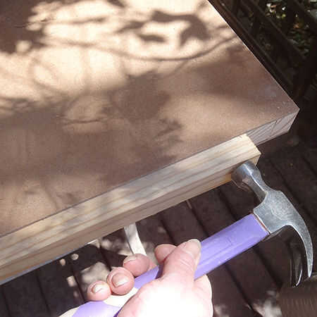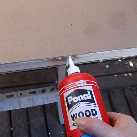 3. cortar el pino de 32 x 32 mm para encajar perfectamente en el hueco en la parte inferior de la puerta y utilice un martillo para golpear este en posición.