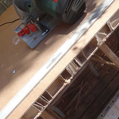 2. las puertas de núcleo hueco más baratas no tienen tanta madera de apoyo en la parte inferior, como sería una puerta más cara. Cuando se corte la parte inferior de la puerta se quedan con soportes de cartón. Pero para solucionar este problema sólo tiene una longitud de 32 x 32mm PAR de pino.
