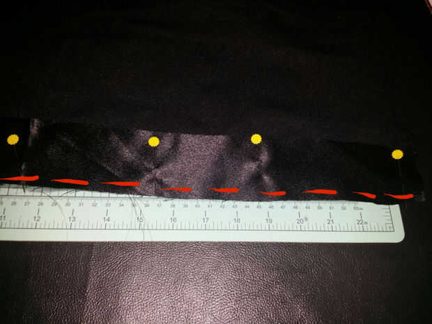 Ahora con el tela principal derecho hacia arriba. Coloque la última pieza cortada de la tela lado derecho hacia abajo a lo largo del borde inferior de la organza y coser con un margen de costura de 1/2 pulgadas.