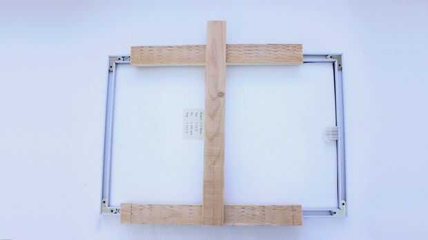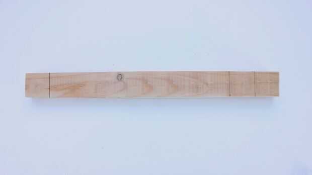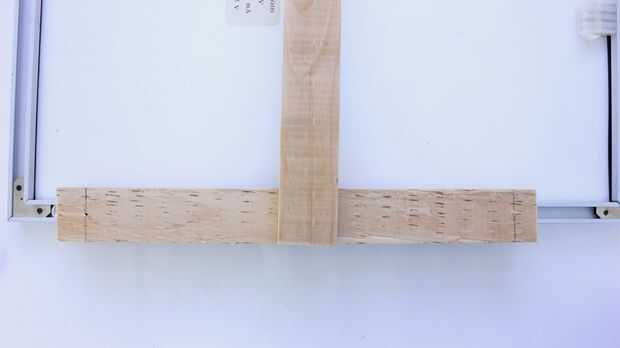 Ahora es el momento para agregar la barra transversal. Poner la tercera barra en la parte superior las barras laterales. Línea que la parte inferior de la barra transversal está al ras con el borde inferior de la barra lateral. La parte superior de la barra transversal debe sobresalir más allá del borde de la barra del lado superior por cerca de 1,5 pulgadas. Esta sección superior se utilizará más tarde para añadir a una guía de alineación. Coloque la barra transversal que interseca las otras dos barras en el medio. Se trata de cómo las tablas se alinearán en el marco acabado.