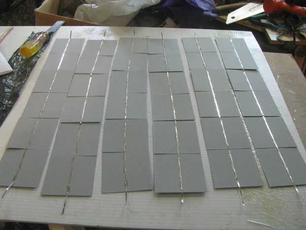 A Resumen de las instrucciones de soldaduras: primero prueba las obleas en una plantilla y dejar de lado aquellos con un bajo voltaje. Marqué la parte trasera de cada oblea con el voltaje en lápiz. Seleccionar pares (o su tamaño de subgrupo deseado) de obleas con sobre la misma tensión nominal para conectar en paralelo. Sobre una superficie plana, correr la pluma de flujo sobre la franja de soldadura sobre las obleas, luego presione el cable tabulación sobre la oblea con el soldador. Aplique un poco de estaño a la punta de hierro para actuar como un agente de transferencia de calor. Debe haber suficiente soldadura previamente estañada cable tabulación de reflujo en la oblea y hacer una buena conexión, pero añadí que algunos como goma de la soldadura. La pasta viene en una jeringa con una aguja - squirt un minúsculo punto (0,5 mm) de pega en las franjas de soldadura cada 2 cm. Entonces suavemente Voltee las obleas, sosteniendo por el cable adjunto de tabulación y conecte el otro extremo. Las obleas son frágiles y tienen un mínimo radio de algo así como 1 metro de doblez, (tal vez) puede ser doblados sobre una obstrucción de más de 1mm de altura. Por lo que puede estar doblados sobre un cable de tabulación, que no tiene grandes manchas de soldadura en él. Las instrucciones que vienen con mi kit recomiendan practicar con las obleas dañadas o de baja tensión. Si en cualquier momento durante la construcción se rompe una oblea, deberás reemplazar en el grupo sin dañar las demás obleas. Afortunadamente no he tenido esto suceda, pero sospecho que no es trivial - puede ser más fácil cortar el alambre de tabulación y empalme que to desoldar limpiamente de una oblea rota.