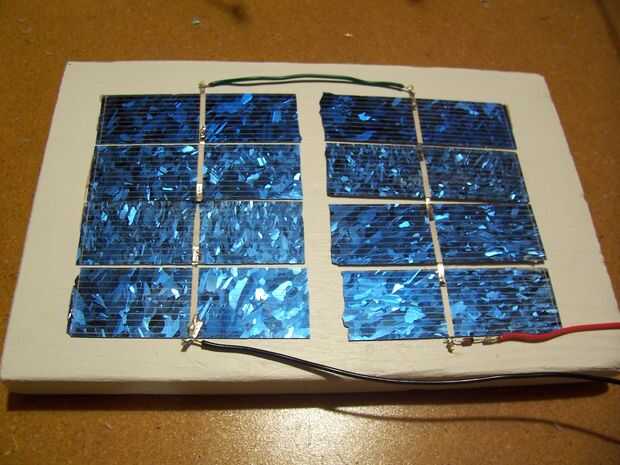 Cortar dos aproximadamente seis pulgadas de longitud de alambre. La soldadura a la cinta conectada a la parte posterior de la celda en la parte inferior para que el cable se señala a la derecha, donde saldrá el panel. Se trata de la conexión a tierra. A la cinta restante, soldar el diodo. La orientación del diodo es importante asegurarse de que no bloquea la corriente eléctrica. Si lo hace, revertirla. Conecte el segundo cable al diodo y que ir a la derecha también.
