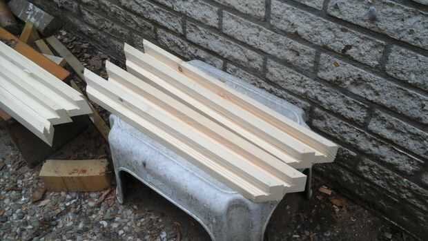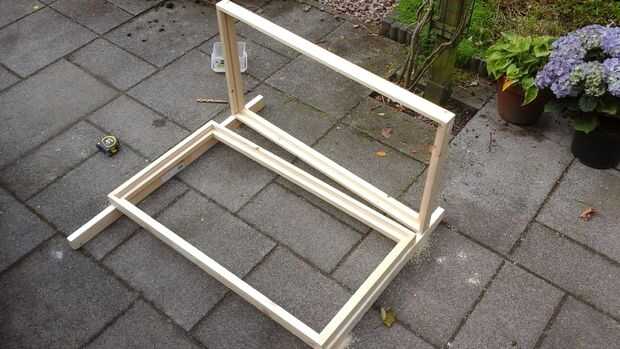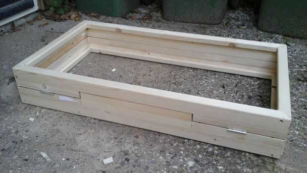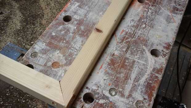 El armazón está hecho de madera de 69x33mm. Usé madera de 44mmx33mm y 27mmx18mm, pero tenían muy poca altura y agregó una banda alrededor del marco para agregar altura. Dos marcos cuadrados igual necesitan ser cortados que solape un poco (10-15mm) el vidrio. Entonces el guardia se retira de una sierra de mesa y la sierra se baja a la cantidad que los vidrios se superponen además algunos extra. Muy Super Extra con cuidado corte una banda de madera de interior de la estructura en cada pieza (en el lado de 33 mm). Luego ajuste la sierra así que dejar 15mm en el lado de 69mm y cortar la banda floja. Se utilizará el orificio que esto deja para el vidrio en el asiento. Pruebe el ajuste antes de ensamblar el marco. Ambos marcos uno encima del otro para ver cómo simétricos son la pila. Esto es importante cuando las bisagras se caben.