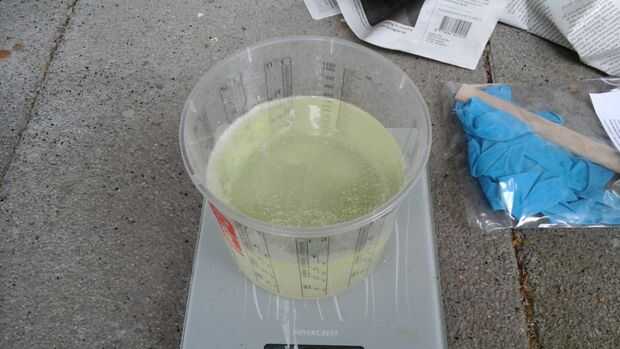 Vierta con cuidado los 2 componentes del epoxi junto en la proporción indicada en la botella y agitar durante unos minutos, pero no demasiado agresivo, las burbujas son nuestro enemigo. Luego vierta con un pequeño riachuelo de alto en una esquina o borde del panel y dejar que el epoxi se arrastran lentamente hacia un lado. Cuando el epoxy ha dejado de fluir, o ha llegado al otro lado. Incline el panel un par de veces de lado a lado para estirar el epoxi.