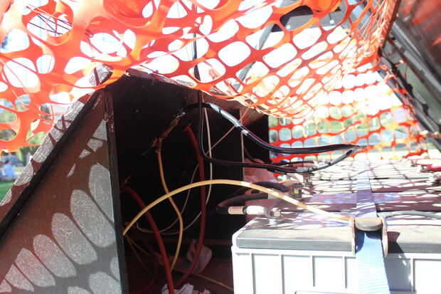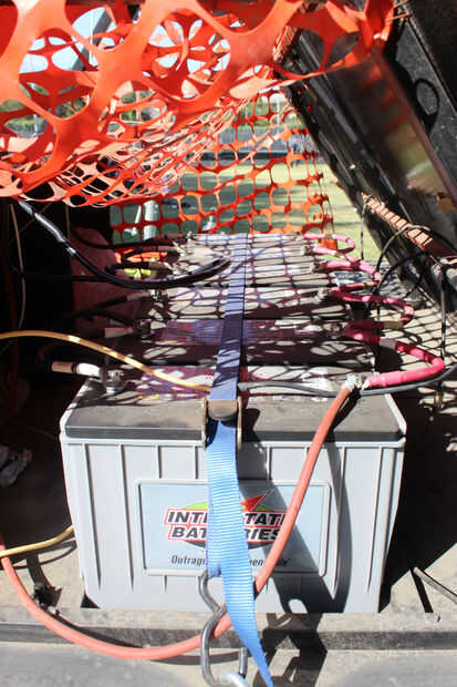 Seis baterías interstate se montan detrás de los paneles solares y en el espacio triangular que crea el marco del metal. Están conectados en serie con cables de batería de coche que han soldado indicadores en los extremos. Los cables al final de las pilas es a través de la parte posterior del panel de madera de contrachapado y conectado con el controlador de carga. Estos cables también pueden corroer con el tiempo así que asegúrese de que hay una cobertura completa de cables metálicos y que las conexiones estén apretadas. Puede utilizarse un óhmetro para comprobar la resistencia de los cables.