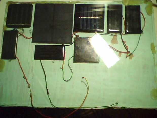 Probablemente ampliará este panel así que es un diseño temporal y el resto del panel tamaño A4 se rellenará con mezcla células, obtenido forma antigua juguetes luces solares de jardín paneles de calculadora incluso añadir una pequeña cantidad de potencia, en paneles de vidrio toma algo de práctica pero es posible.
