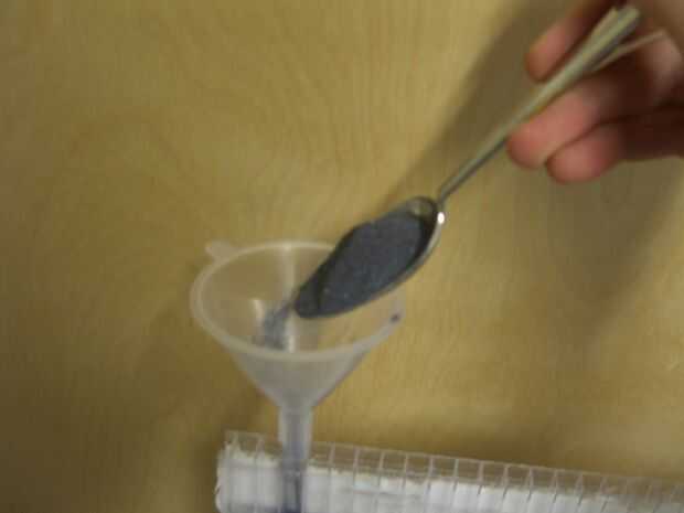 usar un pequeño embudo para llenar cada canal con partículas.  La malla de alambre debe ser enlazada a la parte inferior del panel, por lo que no deben escapar de las partículas.  Usar una máscara contra el polvo o ventilador aquí sólo que tenga cuidado.  No sé si las partículas de carbonato de silicio son malas para usted, pero no me gustaría conseguir ese tipo de cosas en mis pulmones.  Tengo dos consejos desde mi experiencia.