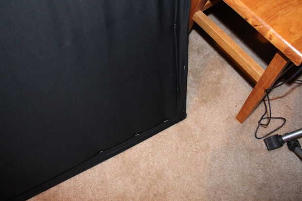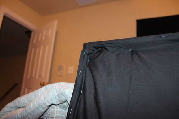 Ahora es el momento para doblar la parte de atrás del panel sobre el cual cubrirá el resto. Asegúrese de que cuando se grapa la parte de atrás intenta apretar la tela tanto como sea posible. Para la parte de atrás de la grapa, ir primero por la izquierda y dejar lados grapado hacia abajo en el marco de alrededor de 3.5" entre grapas en esta etapa. Usted debe grapar la tela posterior y la tela del lado por la perforación de abajo. Ahora que usted grapa la parte posterior su tiempo para darle un apriete final yendo todo el interior del armazón, empujando con fuerza hacia abajo y tirar de la pistola de grapas hacia el marco (va a utilizar la pistola de grapas boca abajo para esto).