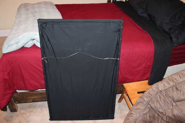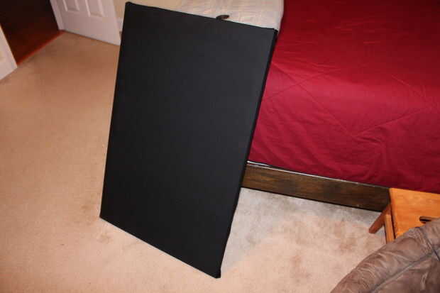 Ahora tienes las grapas a lo largo de la parte interior del marco y la tela debe ser apretada. Añadir un kit de suspensión (utilicé un kit de 30 libras), cuelgue para arriba y disfrutar. Para mí, tenía un colchón de sobra, así cada panel sólo un poco más cuesta $10. Aunque los paneles no funcionan gran acústico en por lo menos son baratos y para mi habitación añadieron algunos mucho contraste para mis paredes.