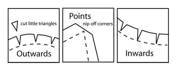 Diagrama: curvas exteriores necesitan poco cuñas cortadas hacia fuera, hacia adentro unos necesitan recortes poco recto, para doblar.