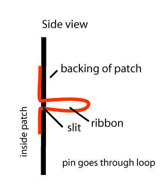 Conectar cualquier sujetadores con su parche (broches, Velcro, cintas para fijación, etc.) a este punto. Pequeños bucles de cinta, empujado por la ranura, con la parte posterior de un pin de seguridad a través de ellos son buenos para la fabricación de chapas que se unen a cualquier prenda de vestir que soportará el peso del parche.