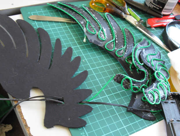Pase los cables por el agujero o agujeros, asegurándose de que los lados equivocados de la parte delantera y trasera están juntos y los hilos del cable de alimentación están fuera de la cola, Aplique pegamento en la parte posterior de parte del lado 'bueno' del parche. Alinee cuidadosamente las piezas y presionar juntos. Repita hasta que las piezas están completamente atascadas, y se debe hacer... aunque, para ser prudente, hice un montón de puntos extras.