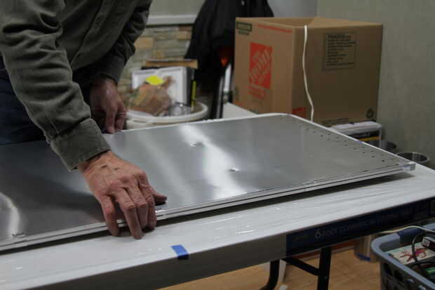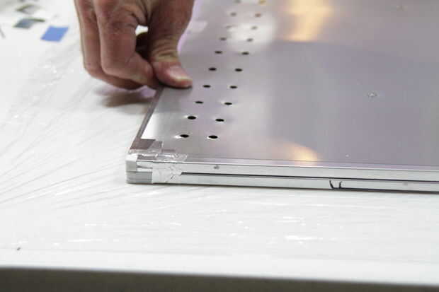 Con la ventana película había grabado en el piso (o mesa) lugar el panel (Cinefoil hacia abajo), alrededor del perímetro de la estructura contra la película de la ventana para asegurarse de que obtener una buena adherencia en la cinta de doble cara.