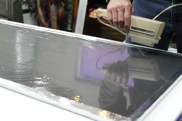 Ahora para la diversión (al menos lo creo). Usar el secador para reducir la película de acabado del panel.