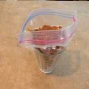 Para que sea fácil, simplemente meta su bolsa en un vaso de boca grande, alto y luego agregar 2 tazas, un embudo boca grande también funcionarían bien aquí:)  Cuidadosamente sello bolso con poco aire en lo posible y luego recostarla.
