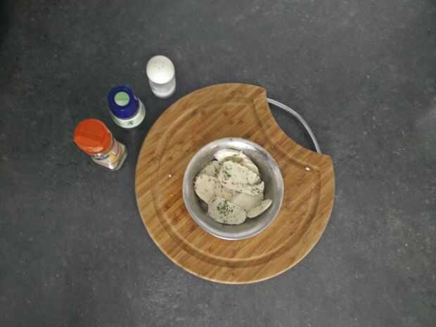 Añadir las rodajas de mozzarella en un bol y añadir sal, pimienta y perejil al gusto.