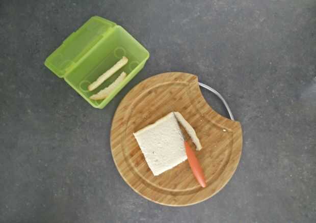 Cortar las cortezas de pan y mantenerlos al margen para su uso posterior en otra receta.