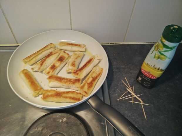 Poner suficiente mantequilla en la cacerola y calentar hasta que la mantequilla se haya derretido. Luego hacer los panes de queso en la sartén. Freír hasta que estén marrones, luego vuelta les (retirar los escarbadientes). Agregue la mantequilla cuando sea necesario. Freír hasta que estén doradas.