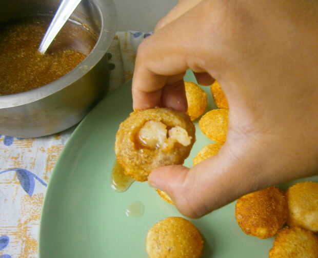 Verter algunos pani (agua) dentro. Ahora coloque el todo puri (bola) en la boca.