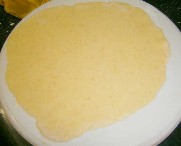 Amasar otra vez. Tomar una porción de la masa y rodillo a un círculo con un rodillo.