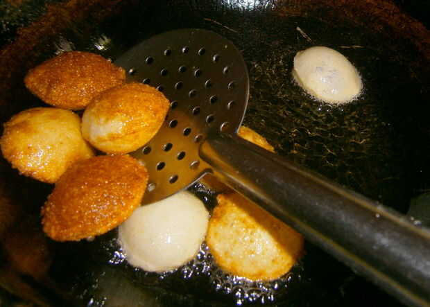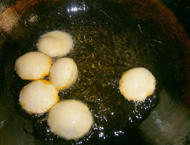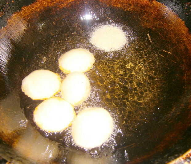 Deslice en círculo algunos cortar la masa en el aceite caliente. Use una cuchara y pulse el centro de modo que consigue soplado para arriba. Cuando un lado se dé vuelta y freír el otro lado hasta marrón dorado claro.