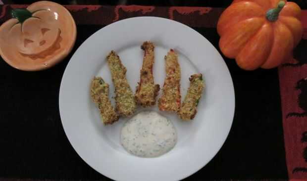 estas delicias crujientes, picantes harán de tu fiesta de Halloween chisporroteo! Esta receta de Rachael Ray es uno de los favoritos de mi familia, usted puede elegir pimientos con el nivel de calor que prefiere, nos gusta una mezcla de plátano semi-hot pimientos y jalapeños. Son empanizados y horneados en un aderezo de queso panko. Estos dedos de pimienta hará una gran noche de Halloween en viendo pelis de miedo, o la receta se dobla fácilmente para servir a una multitud.