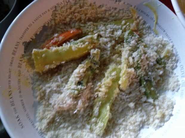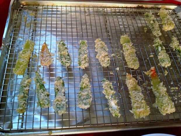 Utilice el método febrero de empanar--F = harina, E = huevos, B = pan rallado. Unos pimientos en la capa en el tiempo la harina, luego en la mezcla de huevo y por último el pan rallado presionando para asegurarse de que la capa de pega. (Suelen hacerlas rodar un par de veces y tratar de mantenerlos por los lados para que el empanado se queda en la parte superior e inferior tanto como sea posible.) Traslado a la parrilla dentro de la bandeja para hornear. Repita hasta que todos los pimientos son empanizados.