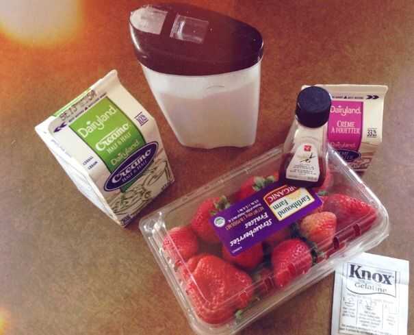 2 tazas de crema espesa1 taza de leche2 cucharadita de extracto de vainilla2 sobres de gelatina sin sabor4 cucharadas de agua3 cucharadas de azúcar(salsa de fresa)1 1/4 taza de helado de fresas1 cucharada de azúcarjugo de limón 1 cucharaditaalmidón d