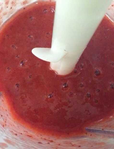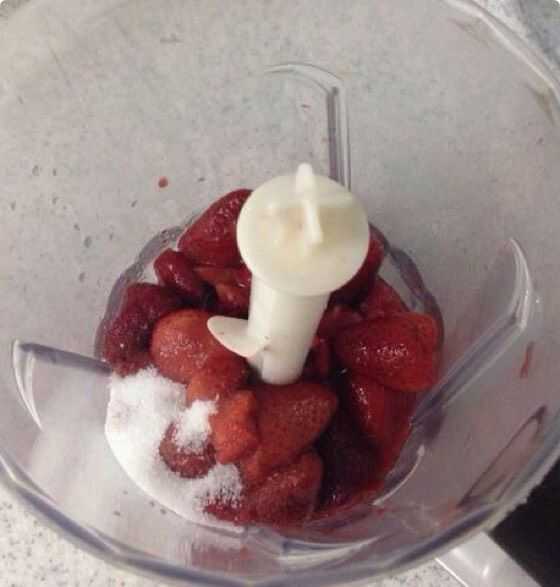 Para hacer la salsa de fresa agregar el strawberry(thawed), azúcar y limón jugo a un mezclador y mezcle bien.