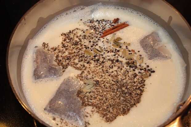 Apagar el fuego y agregar las cuatro bolsas de té y las especias machacadas, que se sienta, cubiertas, durante 10-15 minutos. Cuele la mezcla en un recipiente con una boquilla (para facilitar la colada) y dividir la mezcla en cuatro copas o recipientes individuales. Poner las tazas de rellenas en la nevera durante la noche.