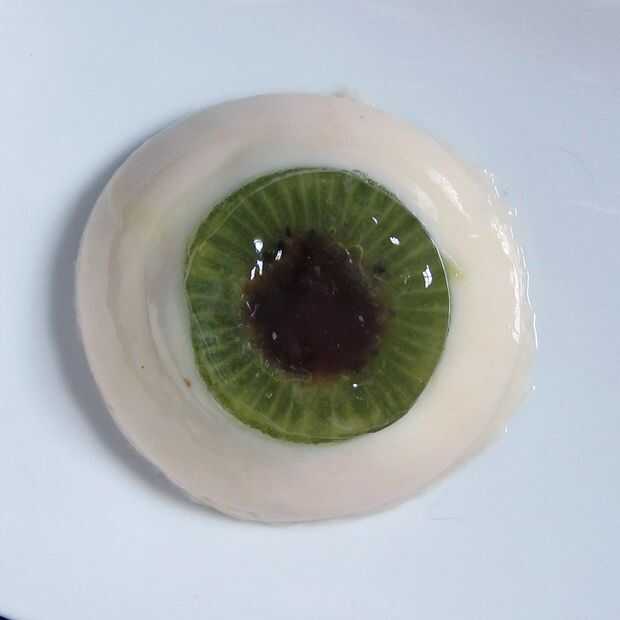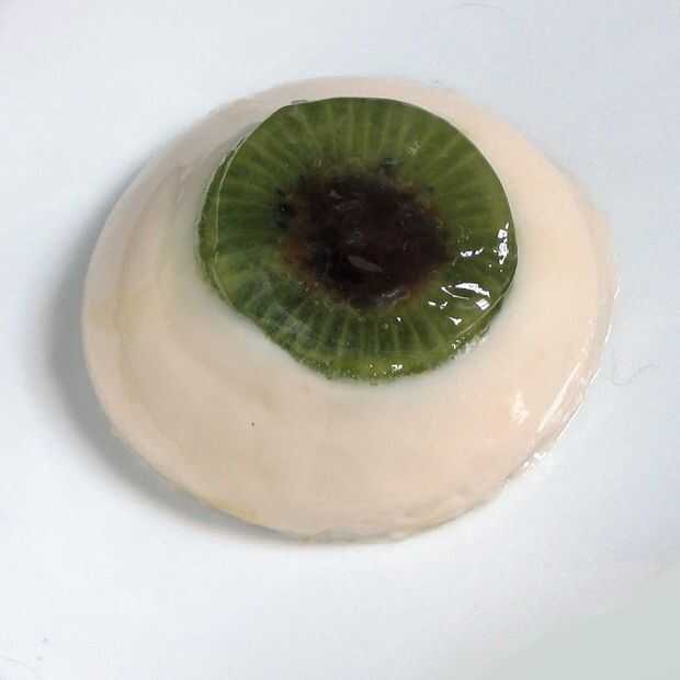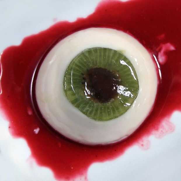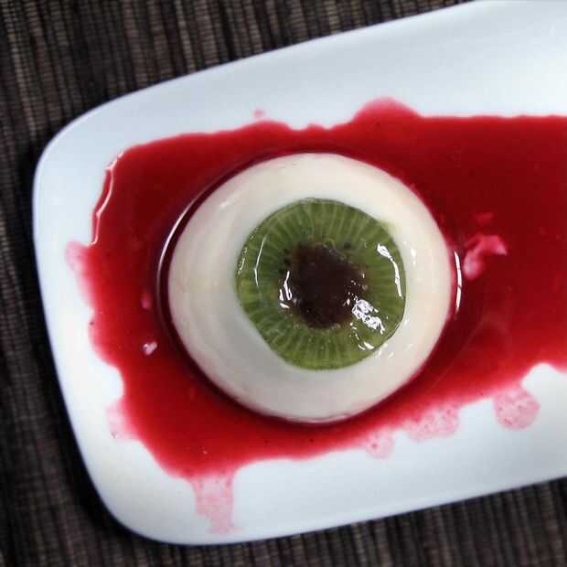 Generalmente no soy uno para gore. Odio las películas de terror (casi siempre). Pero si alguna vez hubo un tiempo para un poco de diversión Gross-fuera es finales de octubre. Y no soy tan scrooge que no puedo disfrutar de una pequeña tontería de Halloween. Así que ¿por qué no hacer un buen plato, mientras estás en ello? Los elementos de este plato son todos naturales: el blanco es una panacota de coco, el iris un kiwi fresco cortado, la pupila se hace de uvas pasas hidratadas, y la sangre es simplemente un coulis de frambuesa. El elemento que es sólo para las miradas es la lente que se encuentra en la parte superior del diafragma de kiwi (una pequeña hoja de gelatina). Mientras que realmente no añade nada al sabor del plato, es el ojo mirar mucho más convincente. Plateado de una manera diferente, este plato puede ser un postre para cualquier noche del año.