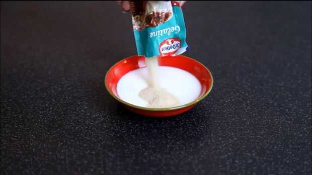 Primero mezclar la gelatina en 2 cucharadas de mesa de leche fría. Dar revuelo y dejar para la floración. Tardará de 5-10 minutos para que la floración. De lado y pasemos al siguiente paso.