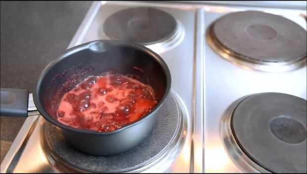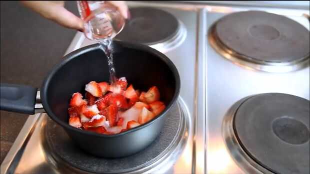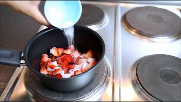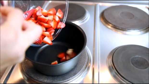 Cortar algunas fresas en trozos. Poner fresas, el azúcar y dos cucharas de mesa de agua en una cacerola y cocer durante sólo 8-10 minutos hasta que las fresas son suaves y el jugo se espese. Debe haber un montón de burbujas cuando se hace la salsa.
