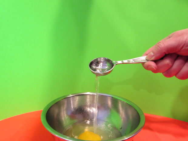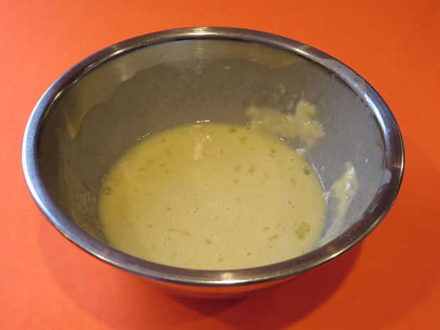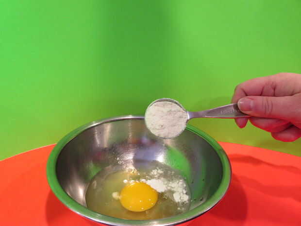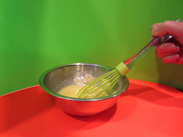 En primer lugar, romper el huevo en el tazón de fuente. Luego agregar 2 TBPS de harina seguida por 3 cucharadas de agua. Mezclar hasta que todo se mezcla muy bien juntos. Esto produce una masa más resistente. Para aquellos que les gusta una mezcla terrón-libre hacen lo siguiente: bate el huevo solo, luego trabajar la harina batiendo como te va. Luego en el agua y mezclar muy bien. Esto hará que una consistencia mucho más fina, el líquido. Existe el derecho o mal aquí, mezcla justa como usted desea.
