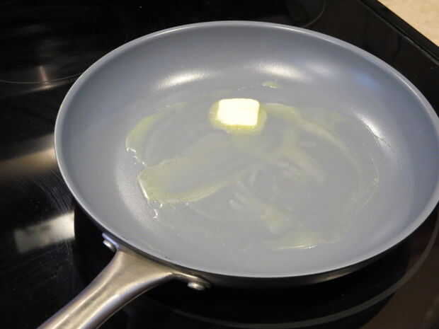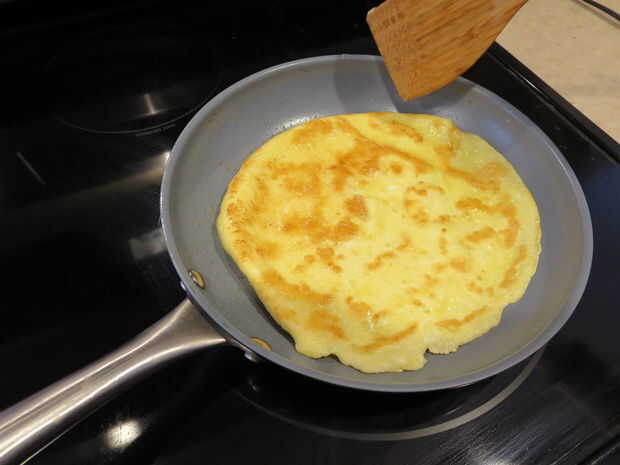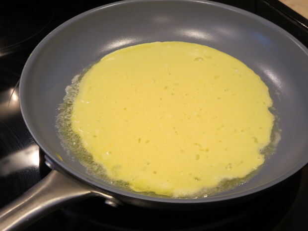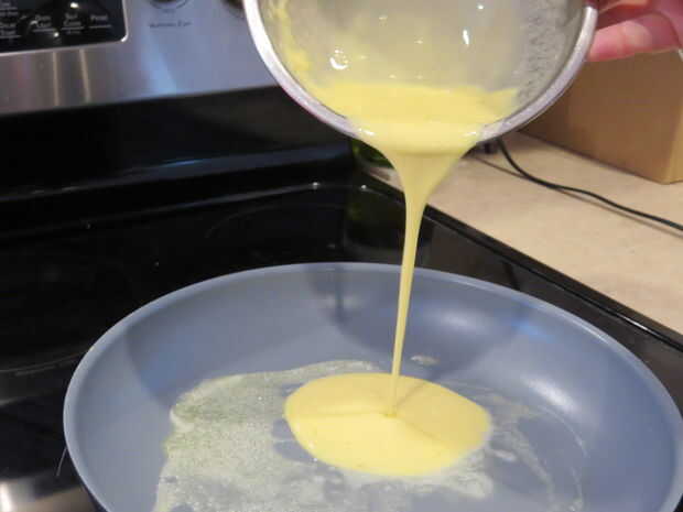 A continuación, vierta la mezcla de huevo en la sartén. Mueva alrededor un poco tratando de hacer un círculo. Pasa nada si no es un círculo perfecto.