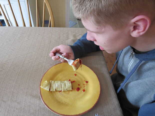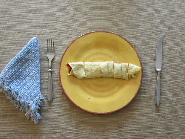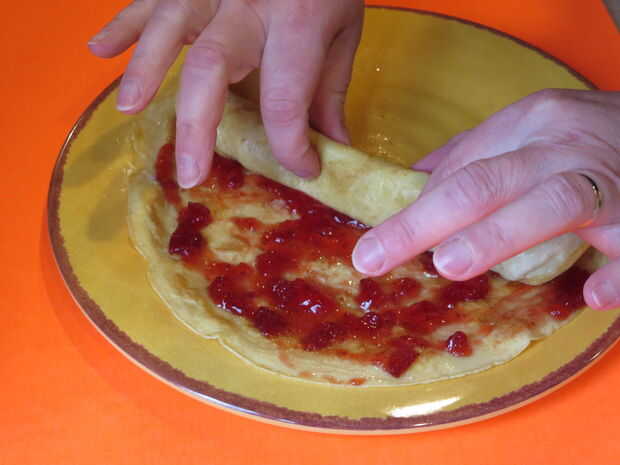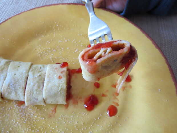 Después de ha terminado de cocinar, apagar el fuego y coloque el pannkaka en un plato. Utilizar un cuchillo de mantequilla para extender alguna jalea o mermelada sobre la superficie de la pannkaka. Finalmente, ruede para arriba y espolvorear azúcar por encima. (Este paso no se muestra) Ahora corte en trozos pequeños y disfrutar de esta delicia deliciosa--de mi cocina a la tuya!