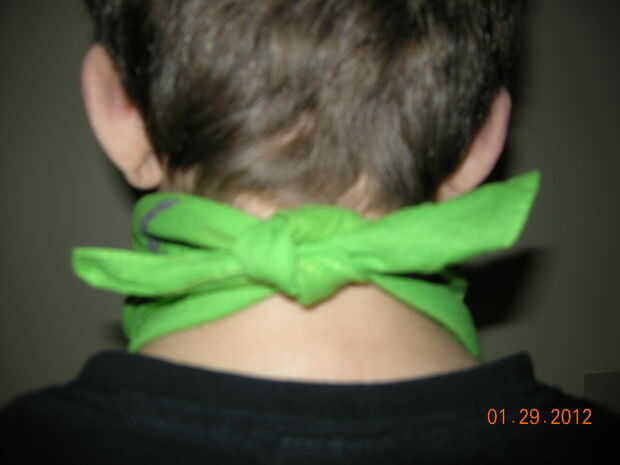 Simplemente atar en un nudo a la parte posterior del cuello o la cabeza del usuario.