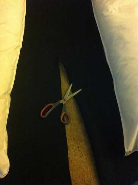 Pone material plana alisando cualquier arruga. Coloque almohadas 5 pulgadas desde el lado del polar. Cortar por el centro. (Nota: estas fuentes hacen 2 almohadas del cuerpo, así que deje suficiente espacio para 2