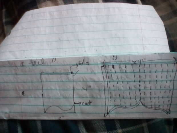 Trabajar con sólo 1 capa, doblar por la mitad (12 x 14), entonces dibuja un comienzo de línea curva en el pliegue. Asegúrese de apoyar firmemente la tela mientras que el corte o la aleta de la cola no puede ser simétrico. Si estás contento con la curva una vez cortadas, poner encima la segunda capa, mal lados juntos y uso como plantilla para cortar la capa 2.