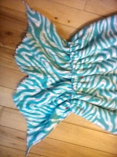Hilvanar el otro lazo a través del borde recto de la aleta de cola. Tire de ella en medir 12" en. Asegurándose que la parte delantera de la aleta de cola hacia el frente del cuerpo, deslice la aleta de cola dentro del recogida final del cuerpo. Ajustar frunces uniformemente, se alinean los lados de la aleta de cola con alfileres las costuras laterales de la marca y centro de la aleta de la cola con la costura posterior central. Fijar firmemente todas las capas. Medir y ajustar los cordones para asegurarse de que la cola es todavía unos 12" en. (foto 4)