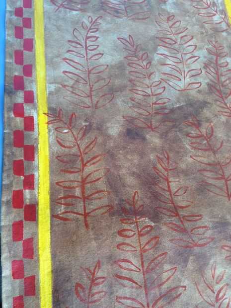 Mi diseño se realizó en varias capas pero también puede pintar un diseño de color sólido o forma libre o diseños geométricos con pocos colores. He pintado el fondo hojas y helechos primero y luego empieza a pintar a los helechos en colores sólidos. Dejo el lienzo seco entre cada color.