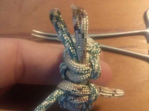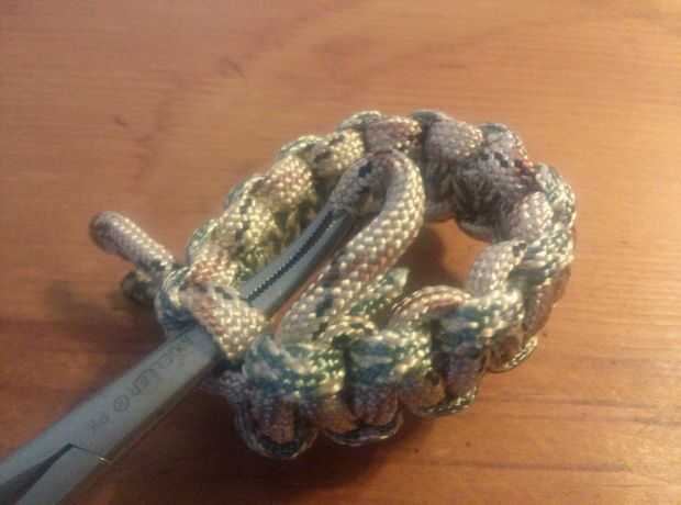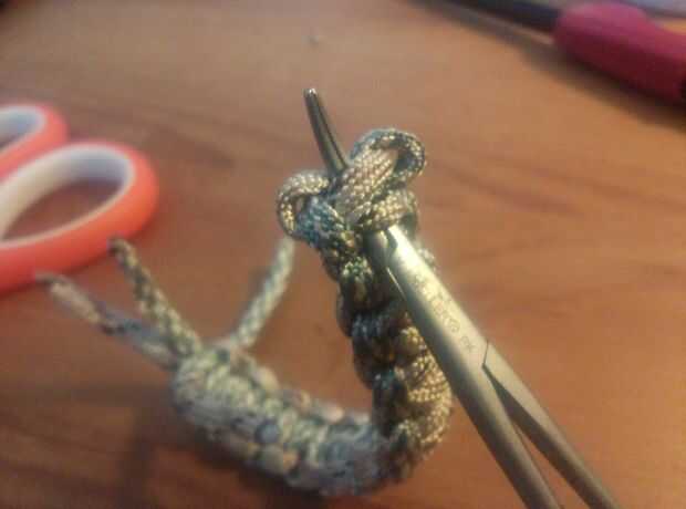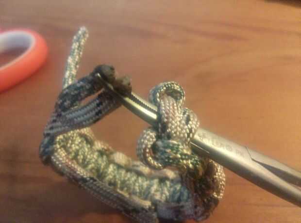 Usando las pinzas, trabajar bajo los dos últimos puntos superior y coge los dos extremos de las cuerdas cortas. Luego hacer lo mismo con los extremos de trabajo de la cuerda, pero tire a través de los lazos que se hicieron cuando empezó el proyecto.