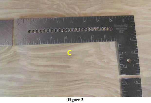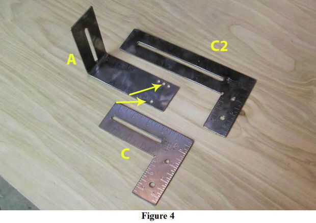 Sección "A" (base de soporte). La porción ranurada debe estar centrada y 3" de largo, a partir de 1" de borde a la izquierda. Perforar las cuatro restantes que se muestra en la figura 4. Los agujeros indicados por las dos flechas amarillas deben ser 1" desde el borde derecho y ¼" de la parte inferior y los bordes superiores; los dos agujeros "extras" deben taladrarse dejando sobre un ¼" de material entre los agujeros. Estos dos orificios "extras" son para las filas superior e inferior de fotos panorámicas de varias hileras. Por último, hacer un grado de 90 doble 5½" desde el borde derecho. Este tipo de metal está destinado a ser duro y resistente, por lo que esperan doblar para tomar un poco de tiempo.