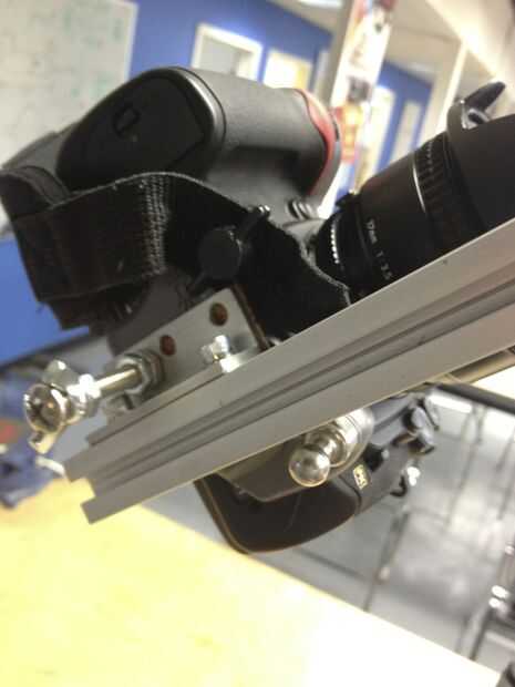 Para la alineación óptima, el eje óptico de la cámara debe estar alineado con el agujero del pivote. el agujero de trípode estándar de tu cámara probablemente se ser alineado con el centro óptico. Esto suena bien, pero que realmente hace las cosas difíciles. Si usted fuera a perforar un orificio de la varilla de la ranura en T, entonces no puede desplazar la cámara más cerca o más lejos del punto de rotación. Cada lente que usas tendrá una distancia diferente. Creo que el mejor plan sería una liberación rápida montarse a un corchete angular de cierre, que puede aflojar los tornillos y deslice el conjunto hacia adelante o hacia atrás.