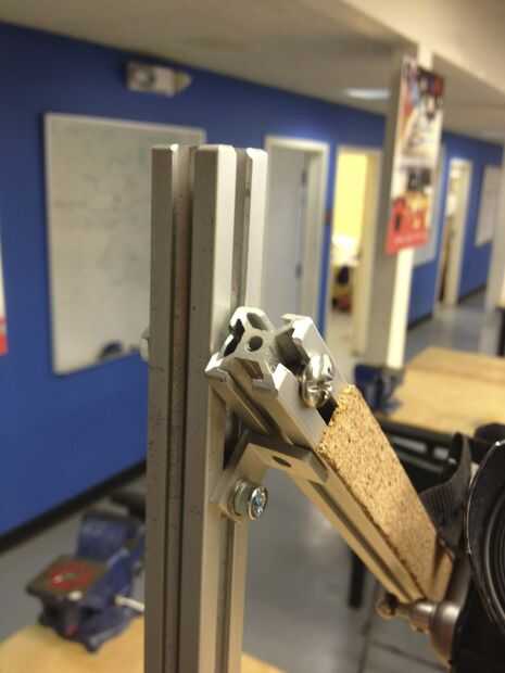 También perforé un agujero en uno de los soportes de ángulo recto para el punto de montaje de cámara. Los agujeros estándar en el soporte eran demasiado pequeños para un perno de 1/4-20 caber a través. Usted notará que he usado un agujero fuera del centro. Tengo un soporte en la parte inferior de mi cámara que se traduce en la cámara con agujeros de 1/4-20 trípode en diferentes puntos.