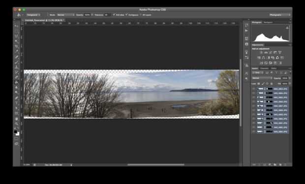 Si usted tomó las fotos de la derecha, el panorama debe salir como una sola pieza larga. Si usted no toma las fotos bastante rápidas y la iluminación cambia, habrá segmentos del panorama. Cada segmento tendrá las condiciones de iluminación diferentes y por lo tanto, no serán capaces de combinar las fotos en una imagen perfecta.